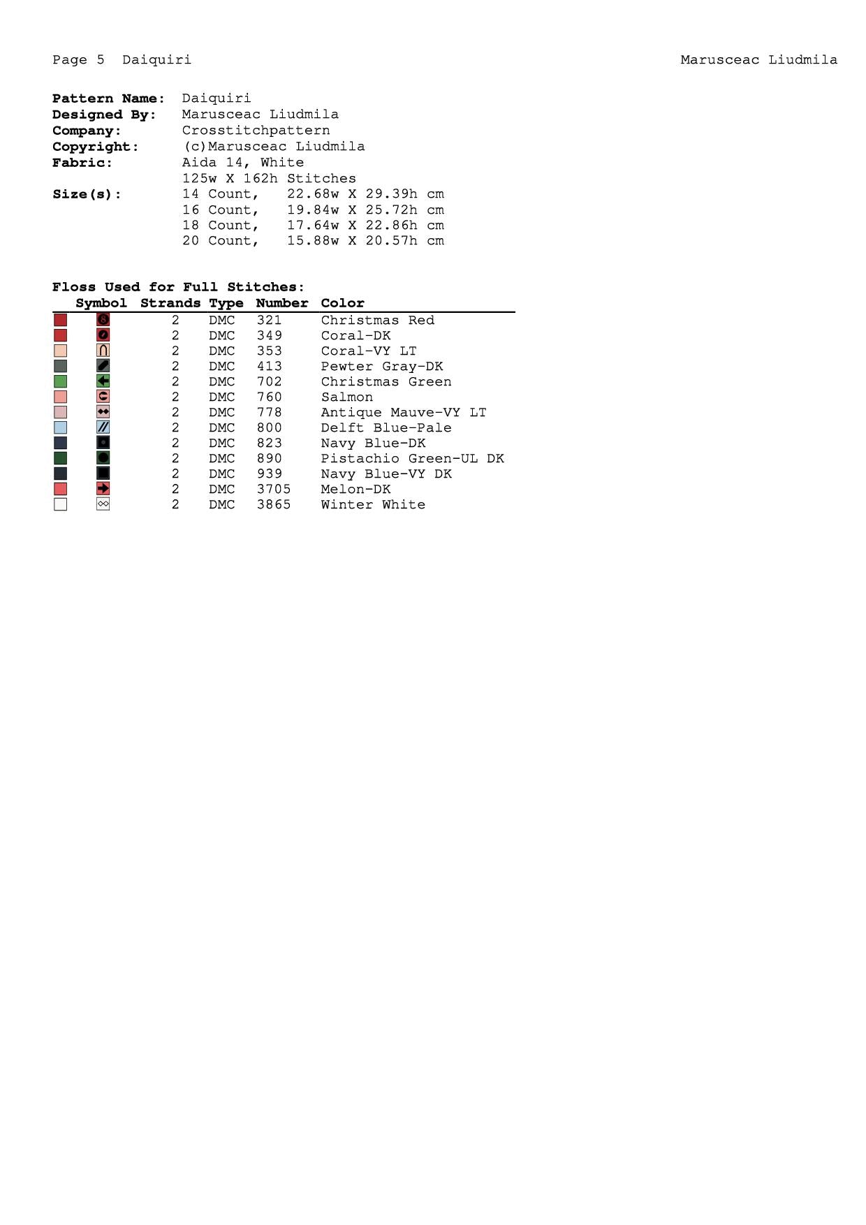 A Symbol Key page in DMC floss code